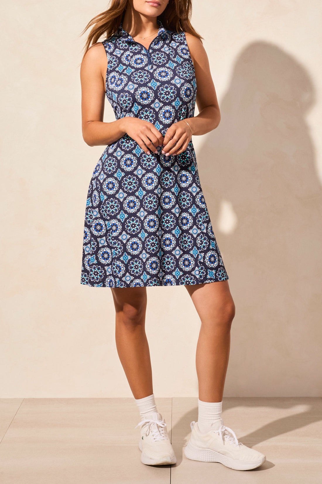 Breeze through warm days in this sporty-chic sleeveless dress, designed for both performance and polish. The textured printed knit adds visual interest, while the moisture-wicking fabric keeps you cool and dry. Built-in UPF 50+ sun protection and antibacterial treatment enhance its functionality, making it perfect for active outings. A zip-accented mock neckline lets you adjust your look and comfort with ease.