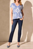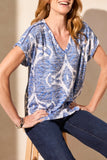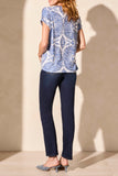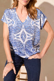 Welcome warmer days in style with this effortlessly chic top. Designed with a wide V-neckline and short cap sleeves, it offers a breezy, relaxed silhouette perfect for sunny outings. Crafted from stretchy printed Hacci fabric, it drapes beautifully while keeping you comfortable all day. Ladder tape detailing at the shoulder seams adds an elevated finishing touch to this easygoing essential.
