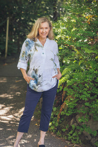 Breeze through sunny days in effortless style with this lightweight linen top, featuring an airy silhouette and a beautifully painted floral print in soft, natural tones. The button placket and mandarin collar lend a refined touch, while roll-tab sleeves let you adjust your look from relaxed to polished with ease.