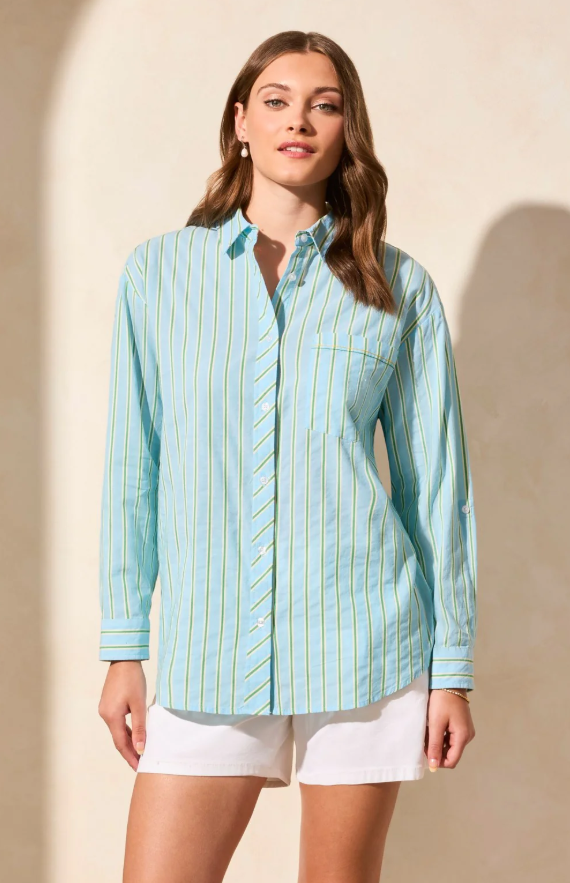 Refresh your wardrobe with this timeless button-front shirt, crafted from crisp, breathable poplin for all-day comfort and classic style. The collared neckline adds a polished touch, while long sleeves with roll-tab details offer flexible styling—wear them down or cuffed for a more casual look. Finished in a subtle double-layer yarn-dye stripe for added texture and visual interest.