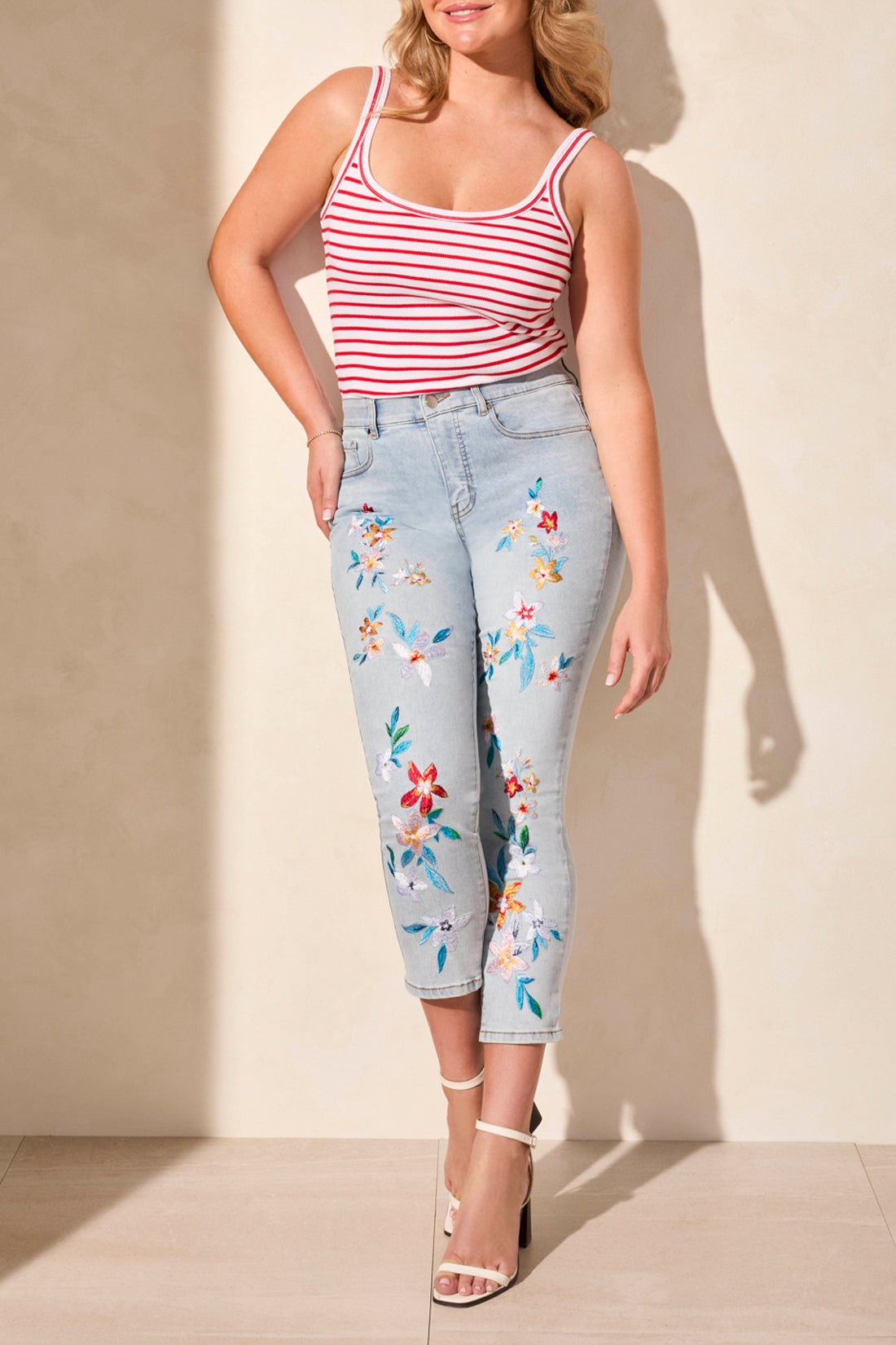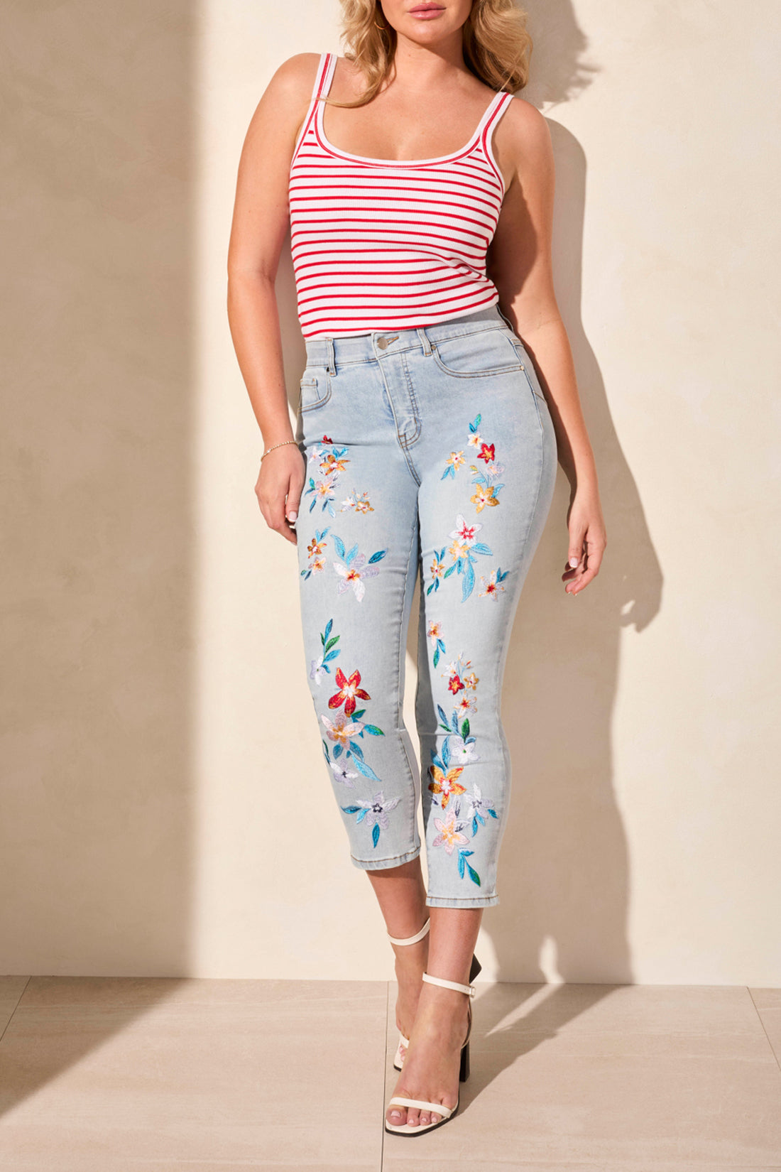 Add a touch of elegance to your denim collection with these curvy-fit mid-rise jeans, featuring beautifully detailed floral embroidery on the front. Designed with a slim leg and contoured upper, they offer a flattering fit that hugs in all the right places.