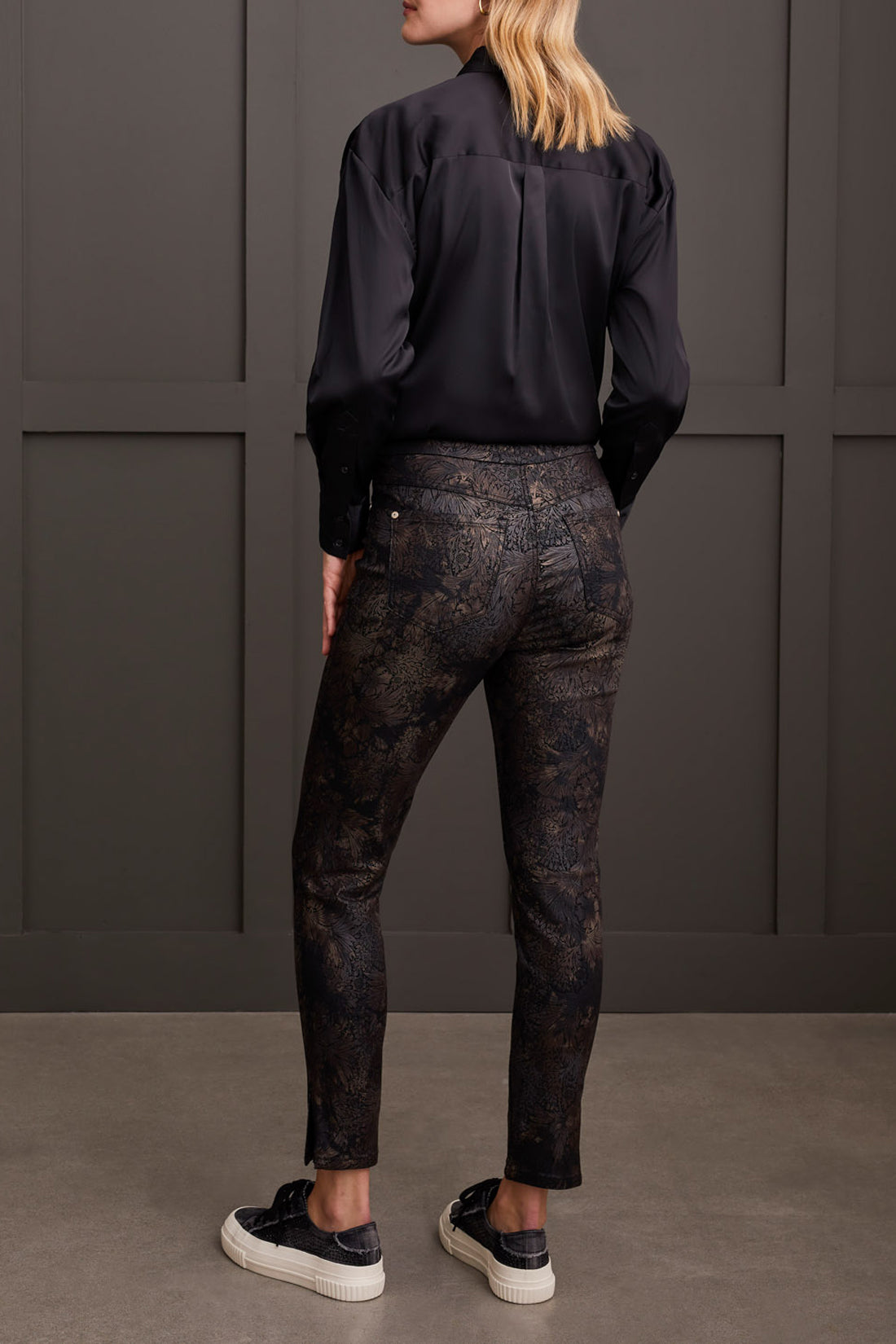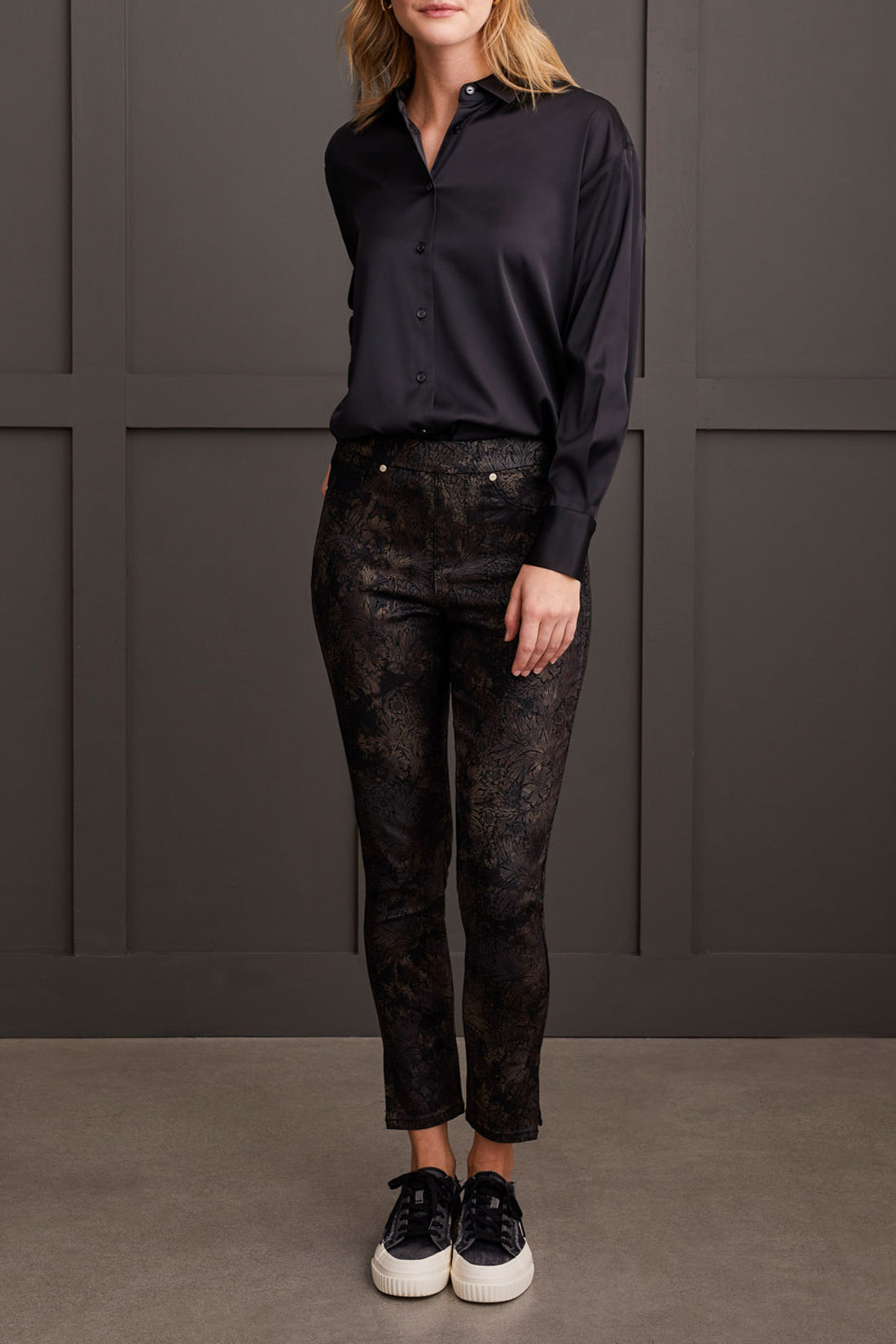 Infuse your on-the-go ensembles with irresistible flair with these polished pull-on ankle jeans, adorned with a stunning metallic bronze foil print design. Designed for effortless elegance, they boast decorative front pockets, a snug upper fit with a flattering 10.5" high mid-rise elastic waist, and a sleek slim leg complete with a 28" inseam.