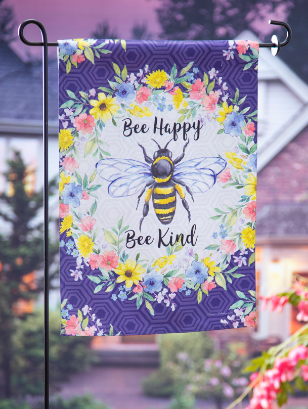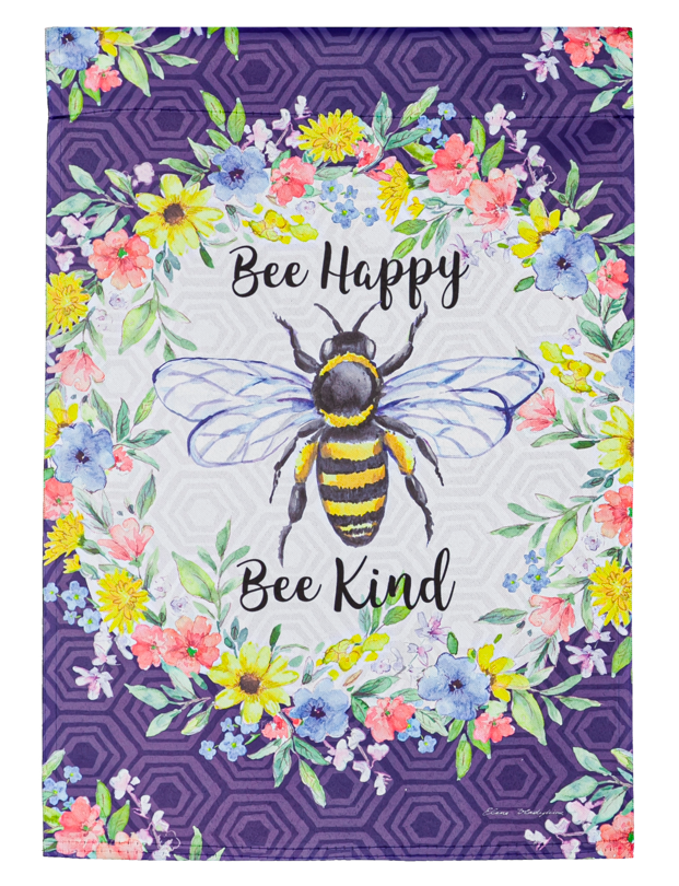 • Inspire passersby with the "Bee Happy Bee Kind" sentiment on this charming Honeybee Garden Suede Flag. A buzzing bee is surrounded by colorful flowers atop a purple honeycomb pattern for a delightful design that is sure to warm hearts and spread smiles season after season.