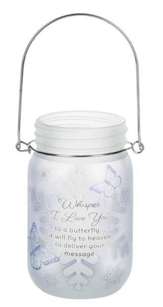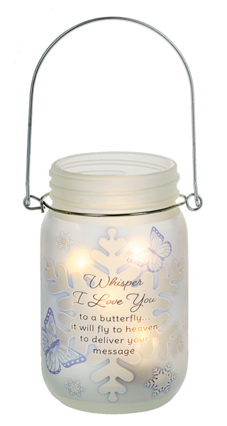 Lit mason jar reads "Whisper I Love You to a butterfly...it will fly to heaven to deliver your message"