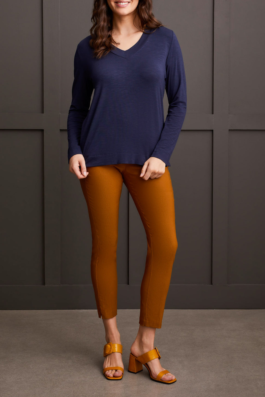 Effortlessly polished and endlessly versatile, this long sleeve V-neck top in rich navy is a wardrobe essential. Crafted from a soft, lightweight fabric with a subtle slub texture, it offers a flattering fit and all-day comfort.