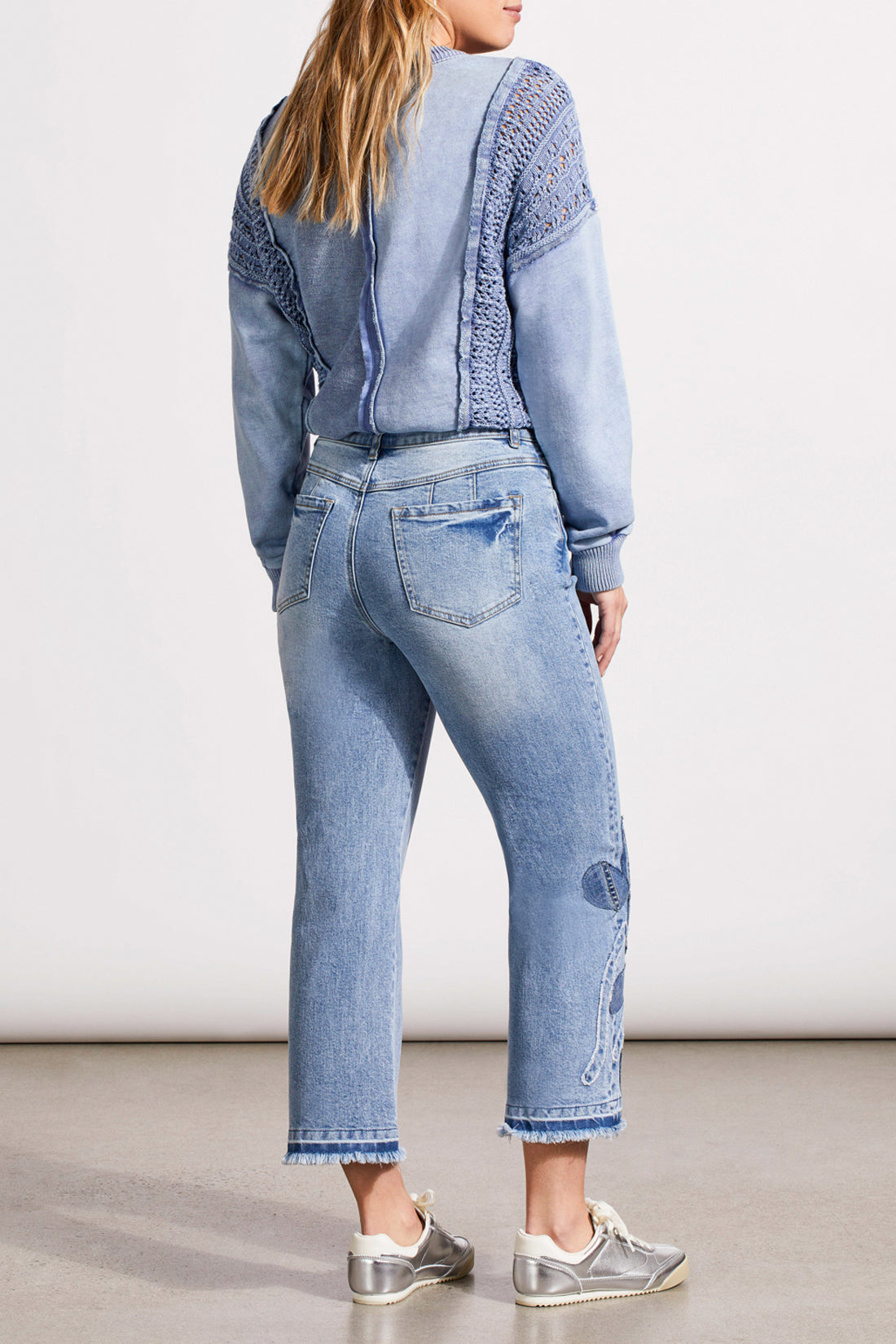 Add a playful twist to your denim collection with these cropped microflare jeans in a soft light wash. Featuring eye-catching floral appliqué detailing and raw-edge hems, these jeans bring fun, texture, and personality to your everyday look.
