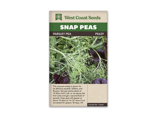 Parsley Pea seeds produce tendrils that are unique and delicious. Technically a snap pea, this curious pea is grown for its edible tendrils, leaflets, and flowers. Harvest whole plants when they are 15-20cm (6-8") tall, or cut above the first node and get a second flush of growth. Plants will produce snap peas at about 70 days on 1m (3') tall vines if not harvested for greens. Try growing Parsley Peas in a 5 gallon patio container or in flower boxes, and harvest the fresh tendrils as needed. They make a fresh and crunchy addition to salads and sandwiches.